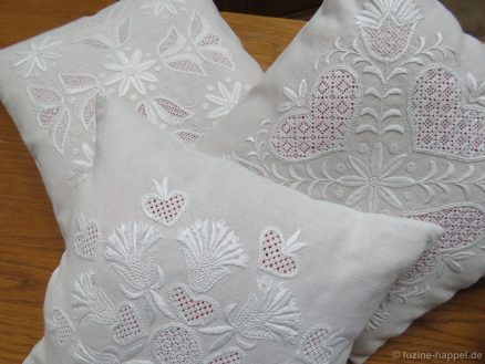 The main motif in Schwalm embroidery is the heart – the domicile of life and the symbol of love. Assumedly, it was originally embroidered as a vessel, from which the Tree of Life grew after being supplied with life-giving water. (The triple shoot stood for the Trinity, and the Tree of Life stood for a long life and eternity.)