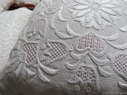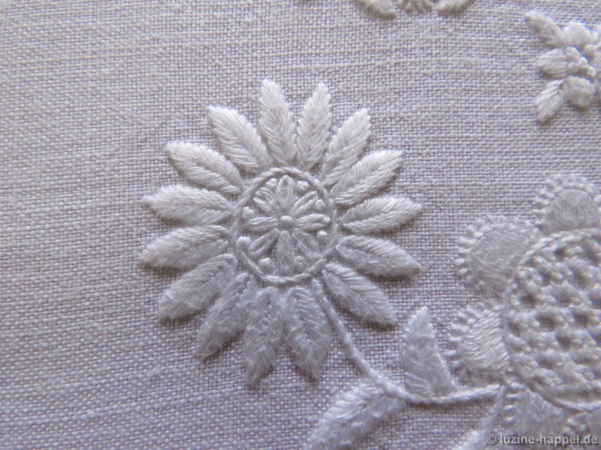 The pomegranate – symbol of fertility, strength, and God´s blessing – was popular in early Schwalm whitework. Later simpler motifs were used to be able to integrate the now modern filling patterns. In this example, the filling pattern does not suit the pomegranate. In later Schwalm whitework, pomegranate motifs are more sporadic.