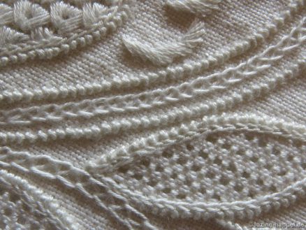 Vielleicht habe ich die Stiche zu groß gewählt, vielleicht auch den Faden zu fest angezogen. Dadurch wirkt der Rand unruhiger als bei den mit überwendlichen Stichen Masche für Masche befestigten grünen und pinkfarbenen Borten.