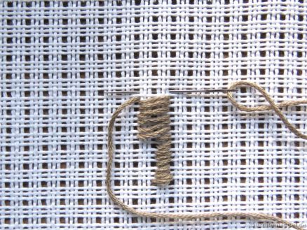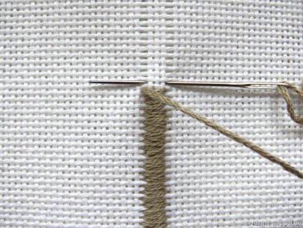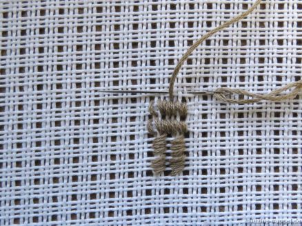 way of working: Bring needle up on the left line and and lay the thread in a loop to bottom and right. Cross over one fabric thread to top and three fabric threads to the right and insert needle. Cross under the three fabric threads to the left and bring needle up one fabric thread to top of the previous emerging point.