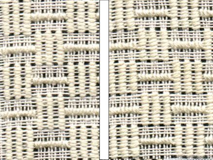 Unlike the use of satin stitches in pulled thread embroidery (left in the image below), in withdrawn thread patterns (right in the image below), the working thread is moved diagonally over each fabric thread, as described above. This is because in pulled thread embroidery, the effect is created by pulling together the fabric threads, while in withdrawn thread patterns, the working thread is the focal point of the pattern. Due to its diagonal position, it does not sink into the groove between the fabric threads but stands out in three dimensions.