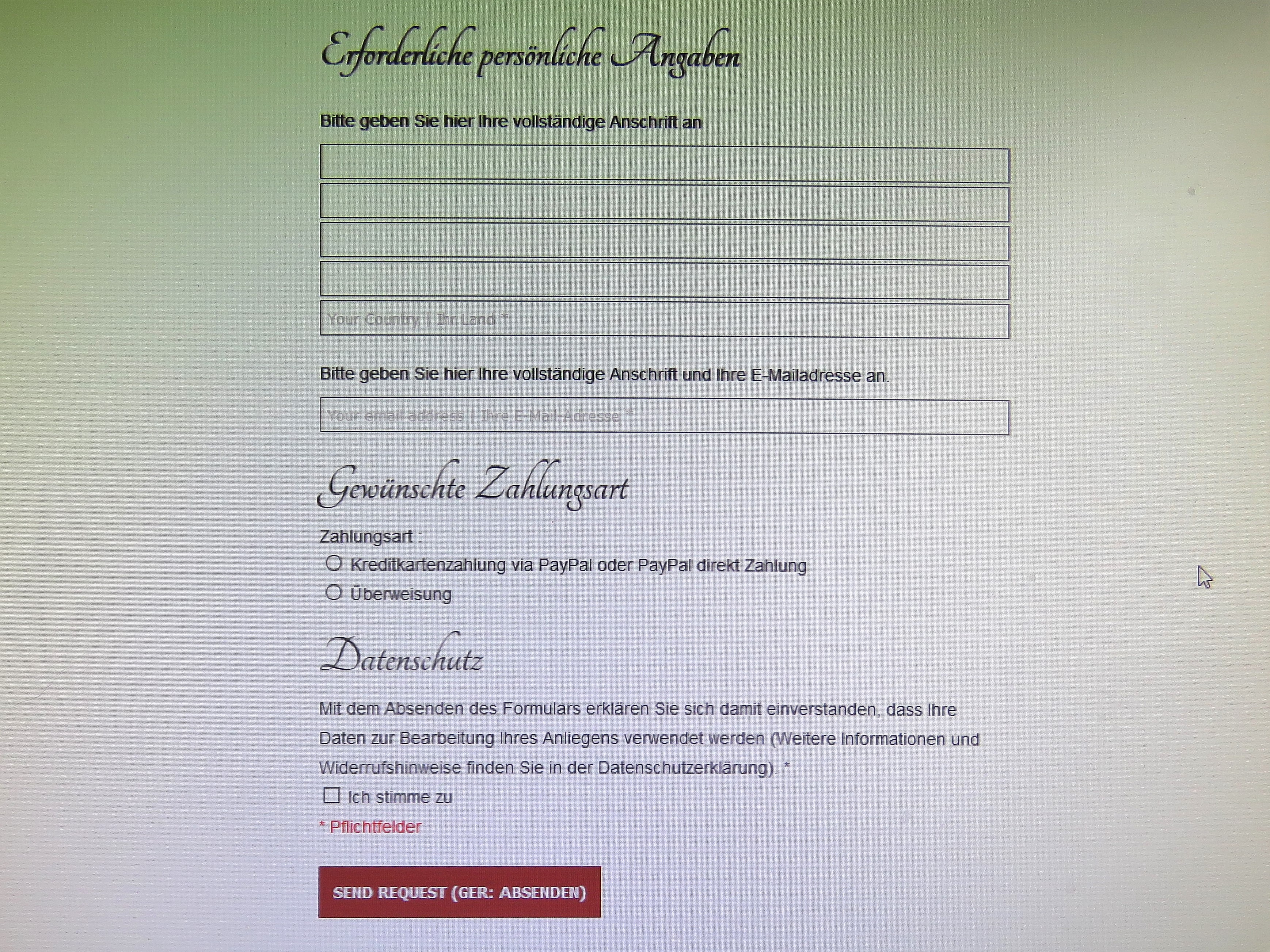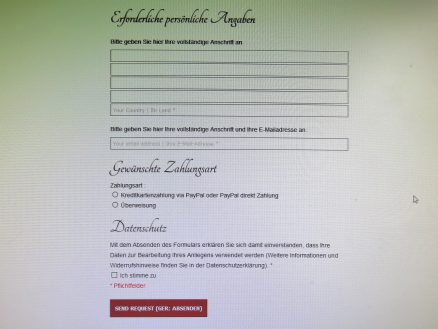 Dort trägt man seine Adressdaten und die E-Mail Adresse ein, wählt die gewünschte Zahlungsart und stimmt der Datenschutzerklärung zu. Dann muss nur noch der Knopf „Absenden“ betätigt werden.