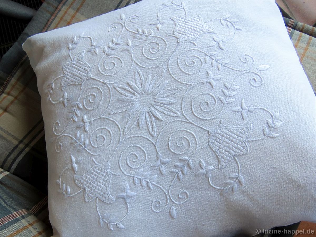 Um ein weiteres kleines Kissen zu fertigen, habe ich das Design ohne Rahmenlinie gestickt. Zuerst habe ich zwei verschiedene Garnstärken verwendet – Vierfachstickgarn Nr. 16 und Nr. 20. Ein dritter, dickerer Faden wäre gut, um die unterschiedlichen Linienstärken der Spiralen besser nachempfinden zu können. So verwendete ich noch zusätzlich Vierfachstickgarn Nr. 12, das ich noch in Restbeständen habe.